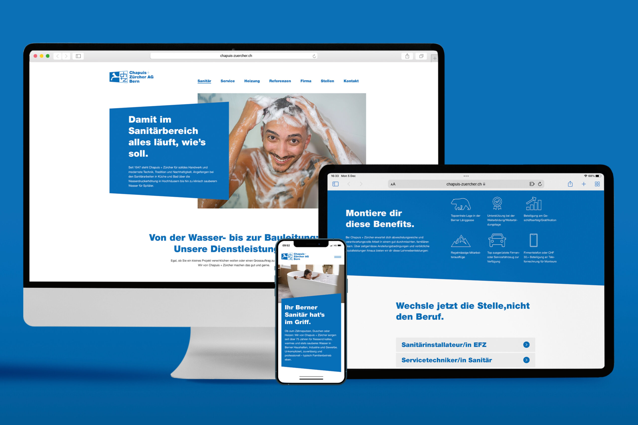 Unser Berner Lieblingssanitär Chapuis+Zürcher hat Spenglerarbeiten und Heizungsgeschäft definitiv an seine Tochterfirmen ausgelagert und konzentriert sich in Zukunft auf sein Kerngeschäft. Eine ausgezeichnete Gelegenheit also, die Website neu zu gestalten und dem frischen Auftritt des Unternehmens in Social Ads, Recruiting- und Sponsoring-Kommunikation anzupassen, der seit längerem die Handschrift von KOMET trägt.